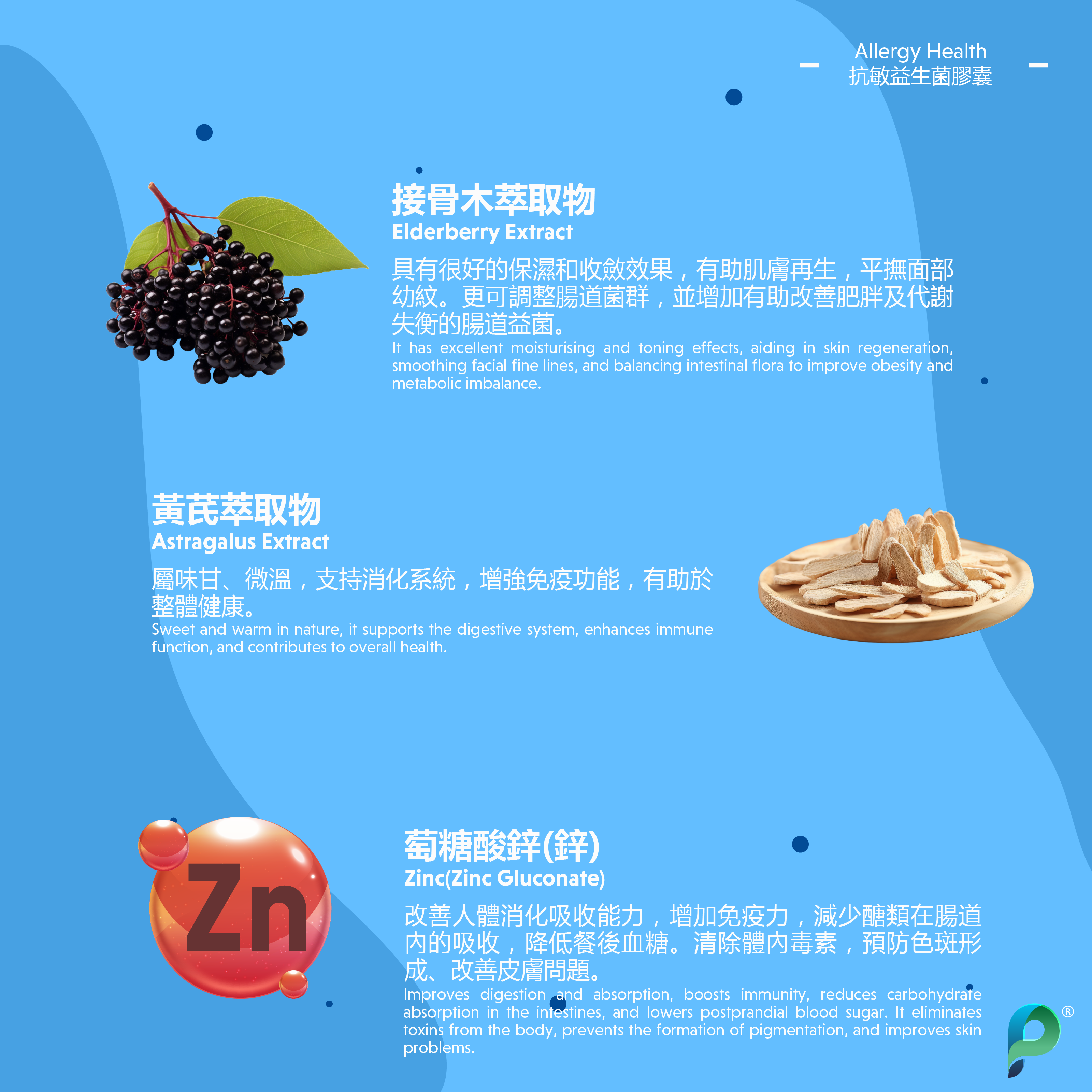 ∙ 30mg 黃芪萃取物: 屬味甘、微溫,支持消化系統,增強免疫功能,有助於整體健康。