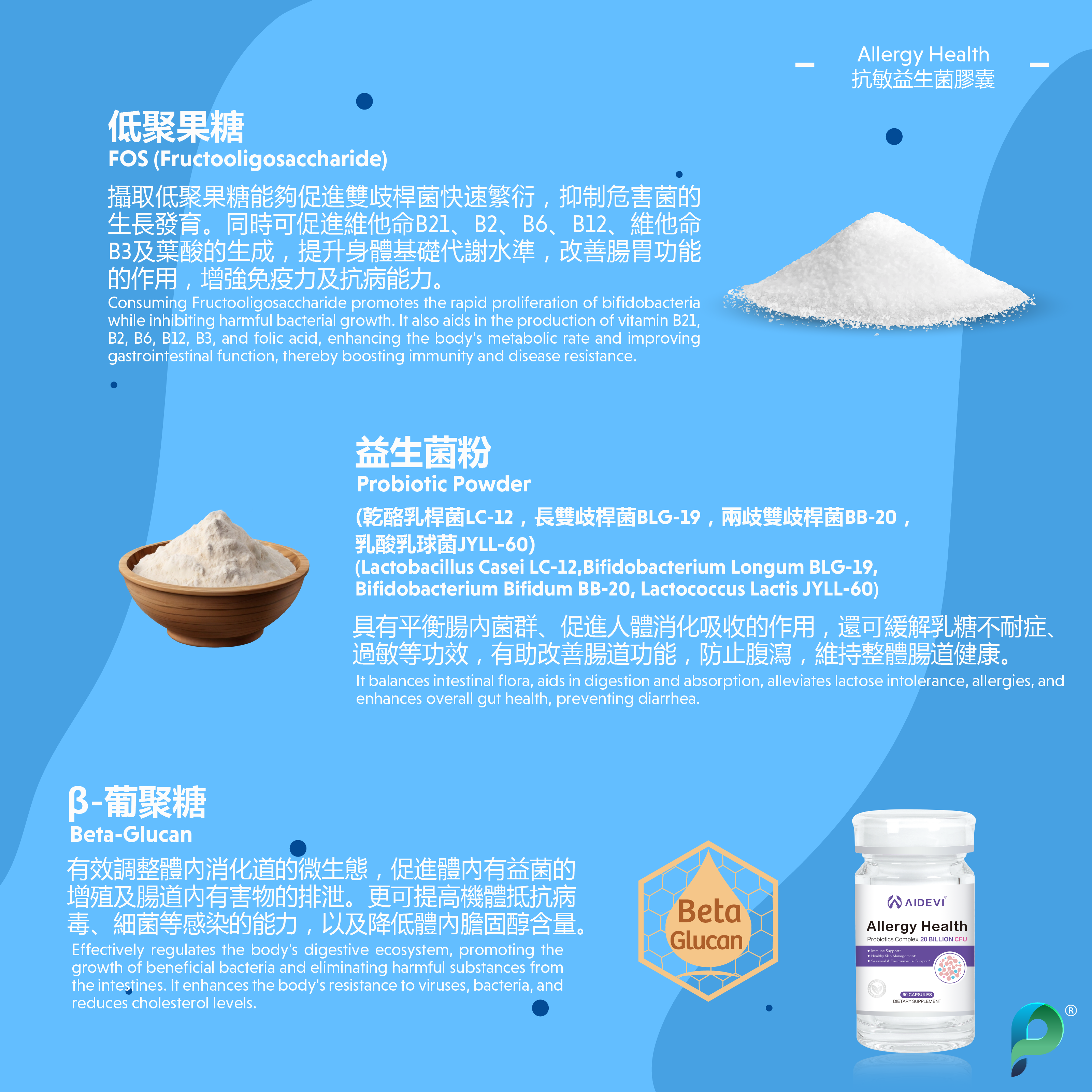 ∙ 200mg 益生菌粉(乾酪乳桿菌LC-12,長雙歧桿菌BLG-19,兩歧雙歧桿菌BB-20,乳酸乳球菌JYLL-60):具有平衡腸內菌群、促進人體消化吸收的作用,還可緩解乳糖不耐症、過敏等功效,有助改善腸道功能,防止腹瀉,維持整體腸道健康。