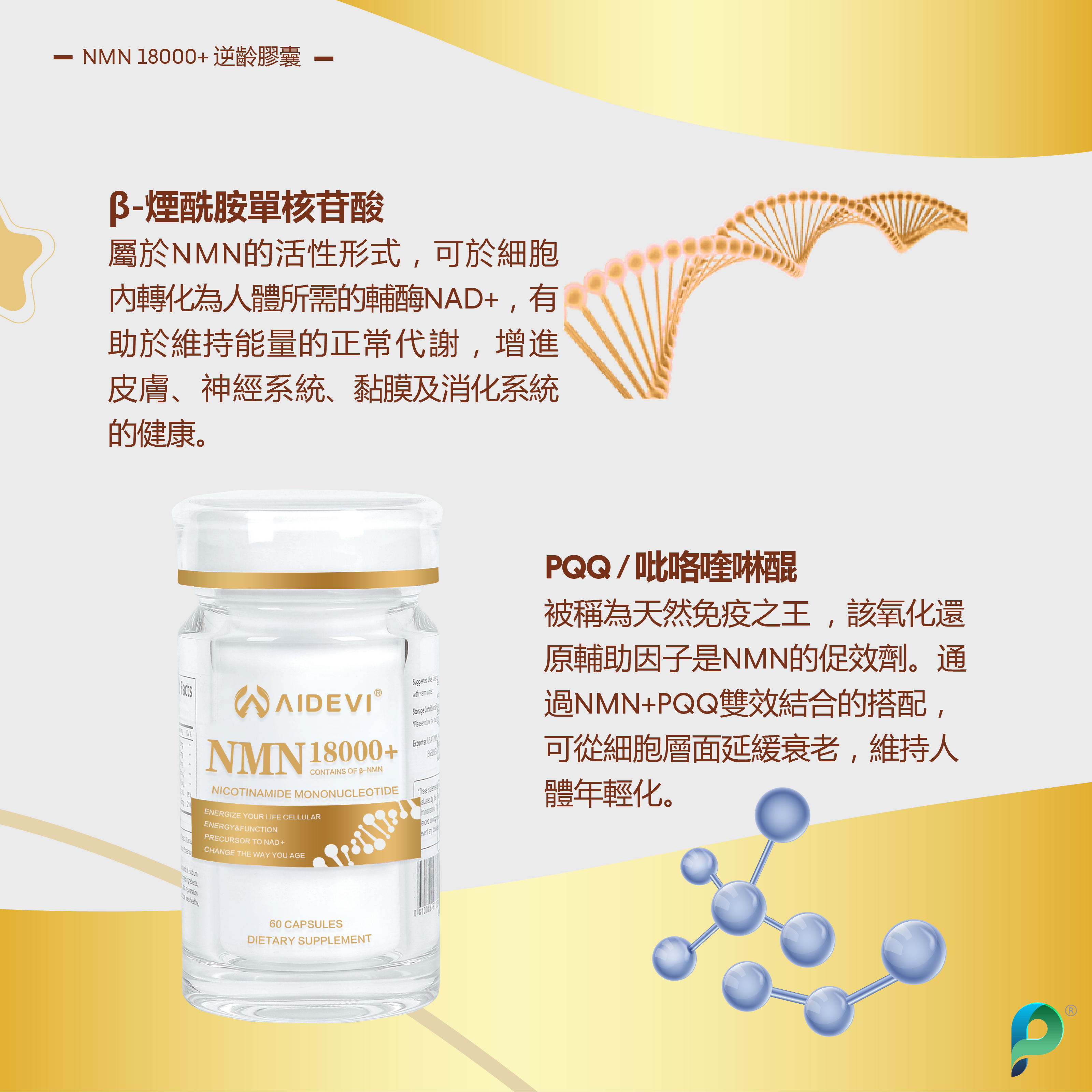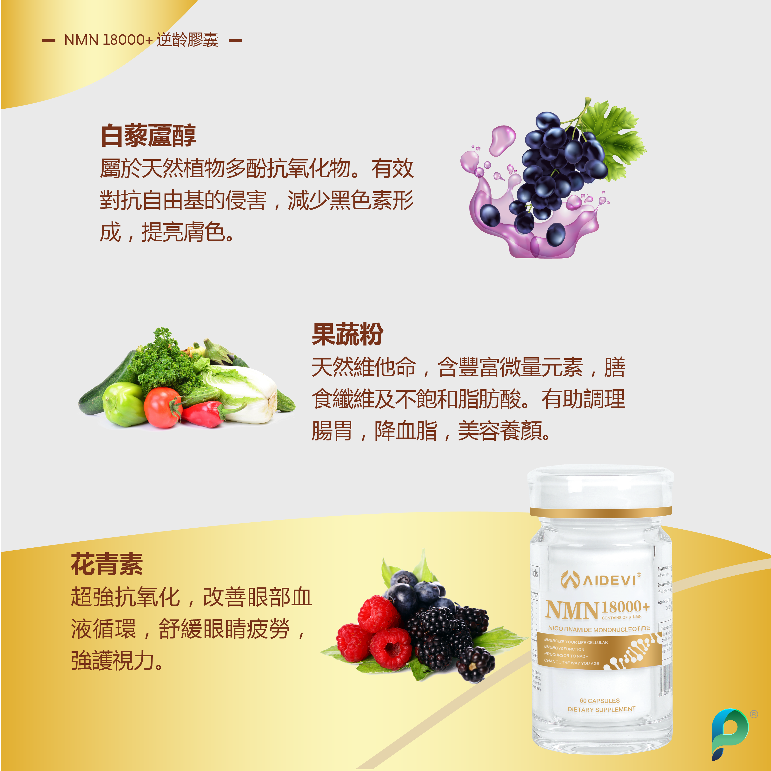 蘊含高濃度NMN成分,搭配其他重要元素白藜蘆醇,PQQ,果蔬粉及花青素,產生協同效應,可減輕生理性衰退,使細胞線粒體恢復至較年輕水平,達至延緩衰老的效果。令身體從内而外逆齡抗衰老,重拾年輕活力。