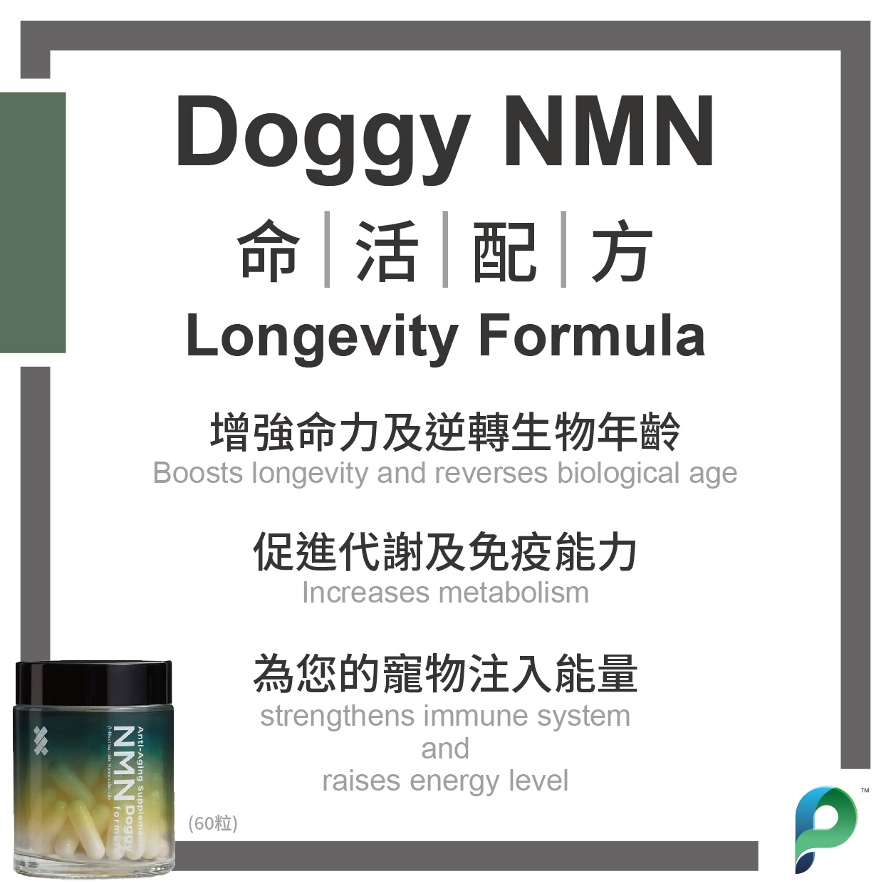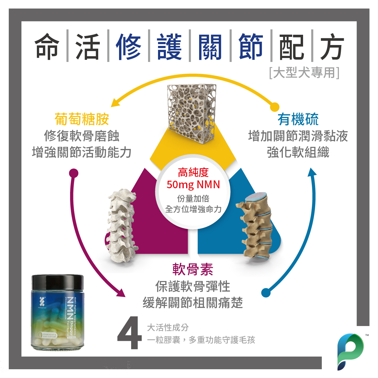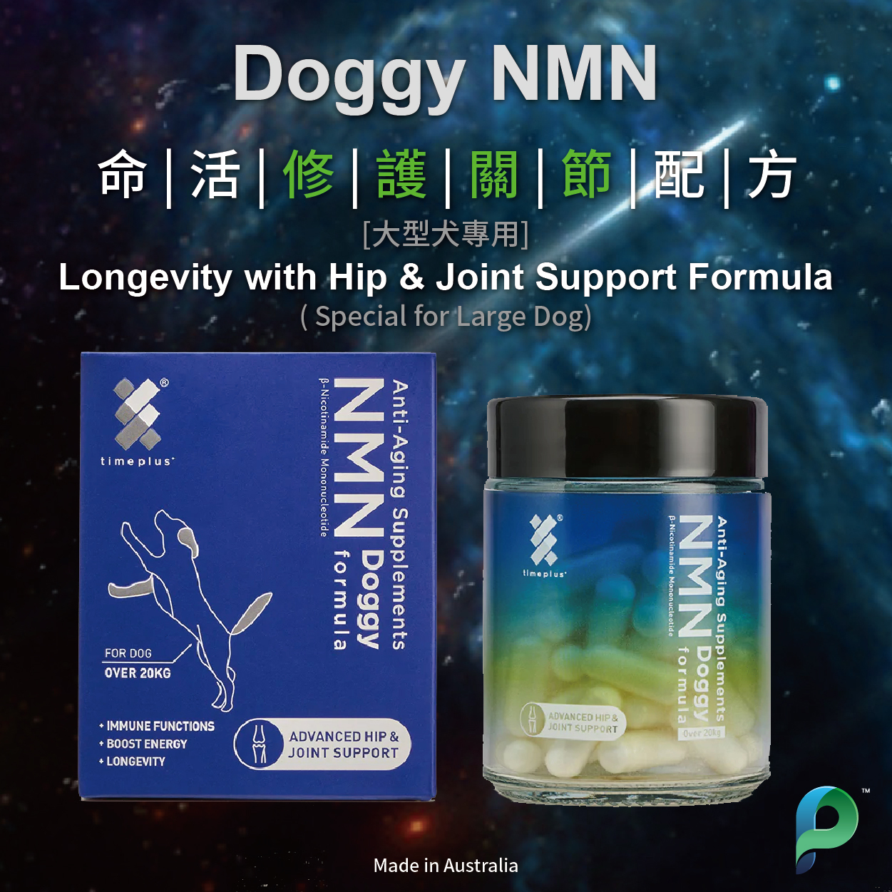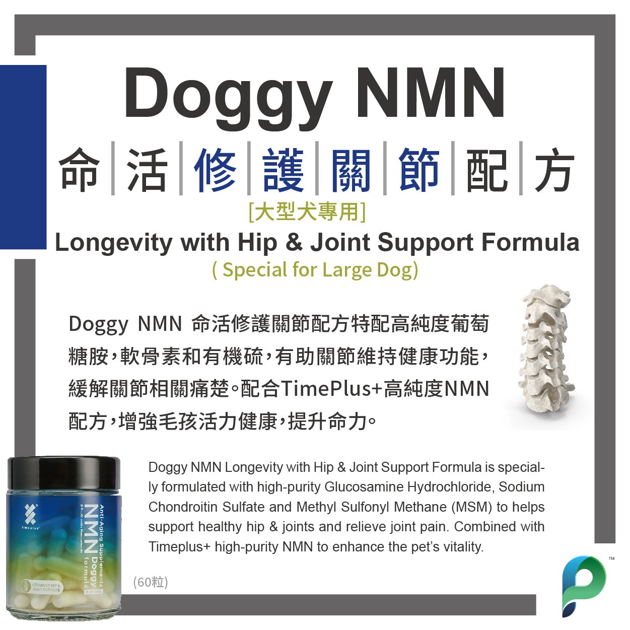Doggy NMN 命活修護關節配方特配高純度葡萄糖胺,軟骨素和有機硫,有助關節維持健康功能,緩解關節相關痛楚。配合TimePlus+高純度NMN配方,增強毛孩活力健康,提升命力。
