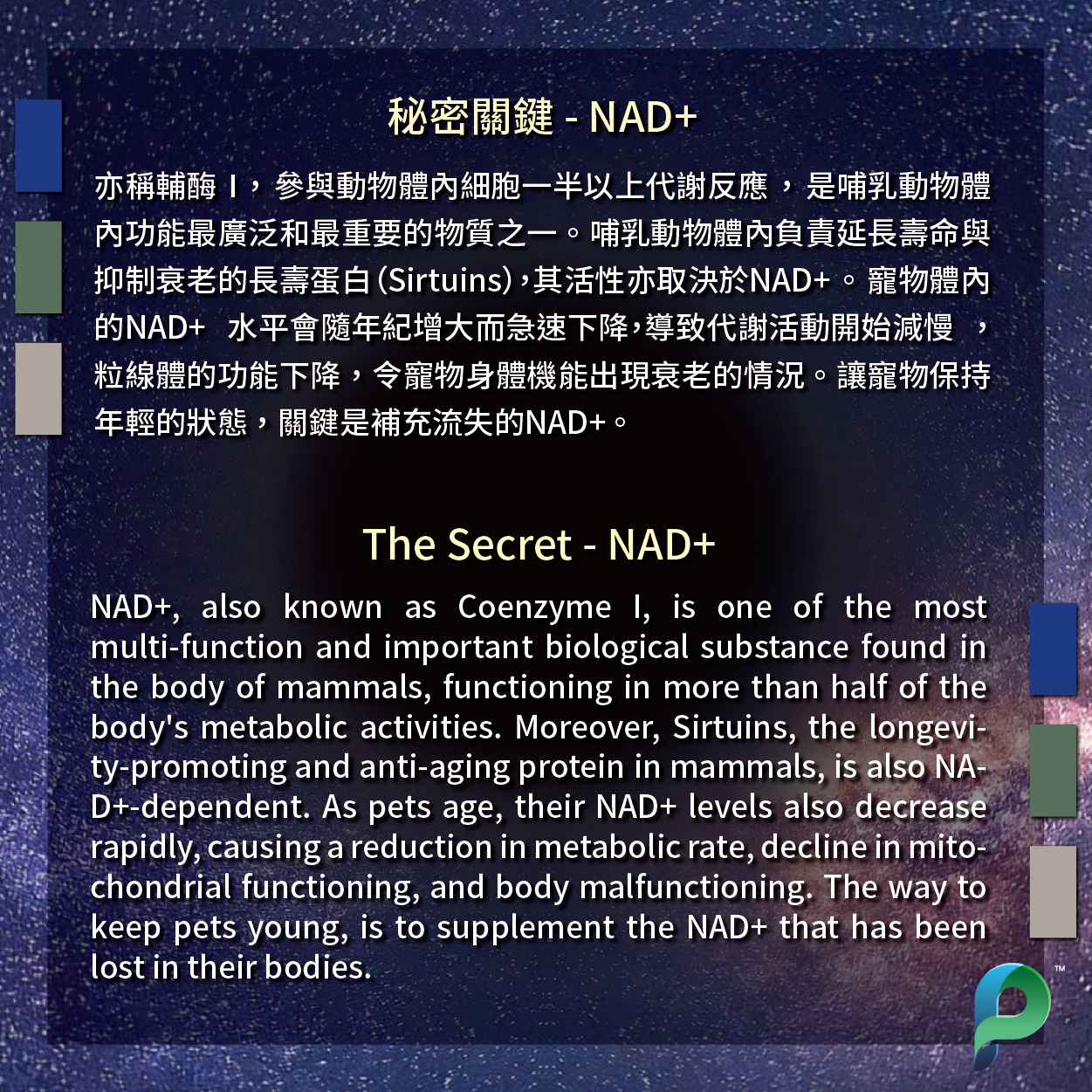 寵物年紀漸大,活動能力會開始漸降。NAD+透過細胞三羧酸循環,微量β氧化等,提供哺乳動物95%的能量。在細胞能量代謝,氧化壓力調節和信號傳遞方面具有必不可少的作用。
